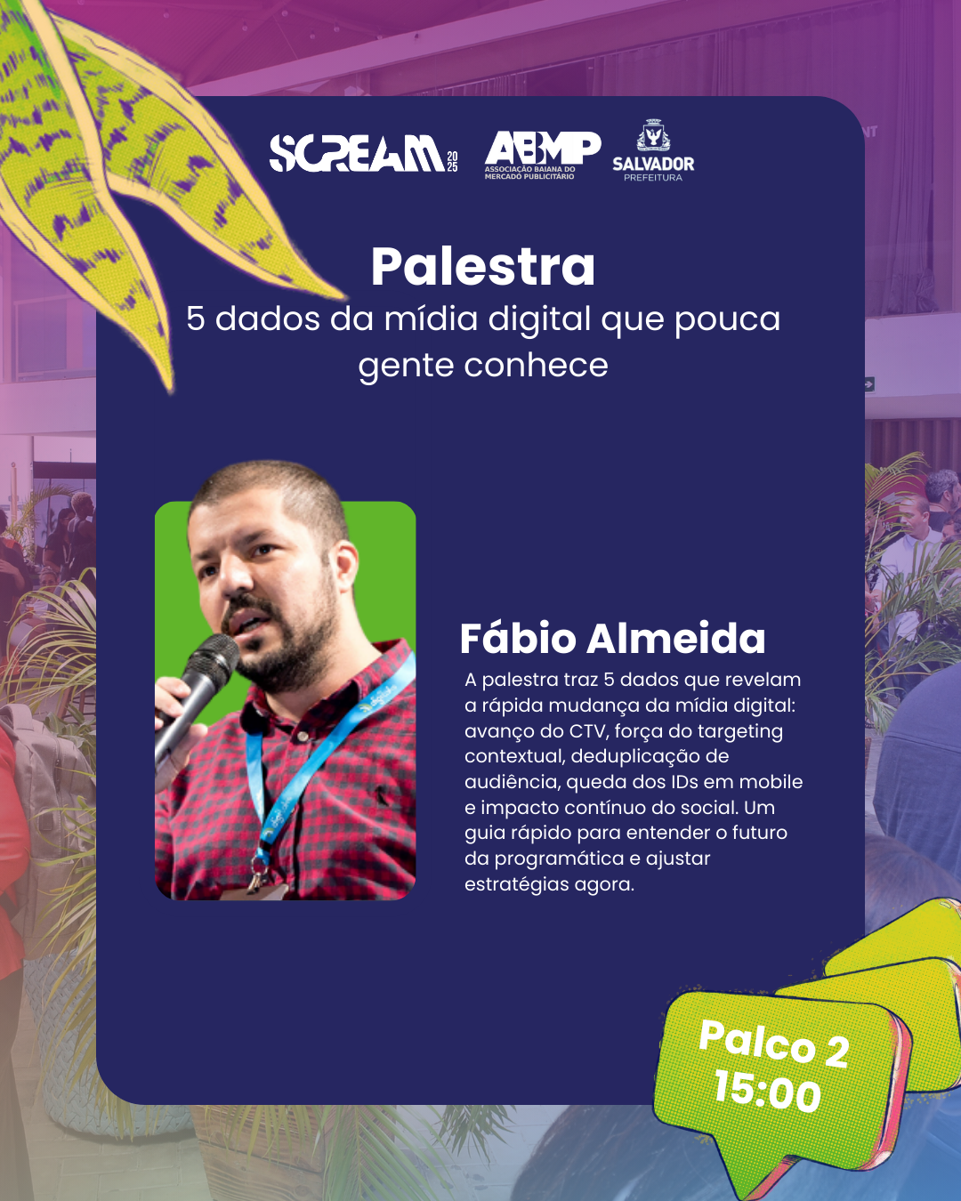 Nesta palestra, você vai conhecer 5 dados recentes e surpreendentes que revelam como a mídia digital — especialmente a programática — está mudando em ritmo acelerado. Do avanço do CTV sobre a TV linear à explosão do targeting contextual e da deduplicação de audiência, os números mostram que estratégias baseadas em contexto, atenção e privacidade já são prioridade para marcas e agências. Além disso, o declínio do uso de IDs em mobile e a força contínua do social media redesenham o mapa da mídia digital. Uma conversa essencial para profissionais que querem se antecipar ao futuro e repensar suas estratégias agora.