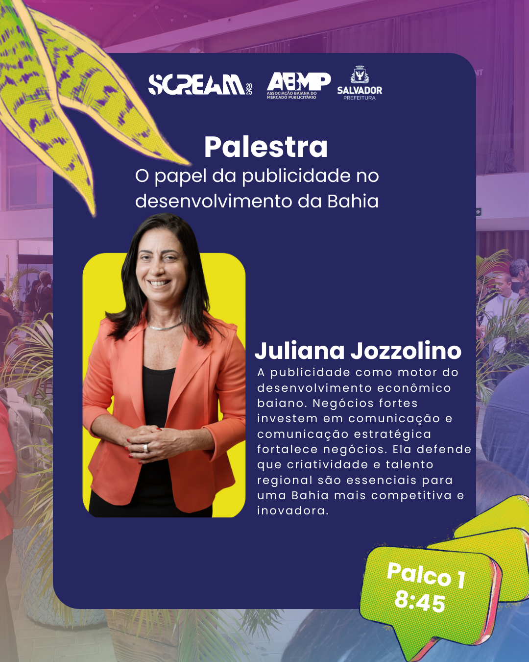 Nesta palestra, Juliana Jozzolino, nova presidente da ABMP, apresenta a publicidade como uma engrenagem fundamental para o crescimento econômico da Bahia. Com empresas fortes, há mais investimento em marca, comunicação e posicionamento — e com publicidade estratégica, essas empresas crescem ainda mais, gerando empregos, movimentando o mercado e impulsionando a economia local. A palestra reforça que não existe desenvolvimento sustentável sem valorização da criatividade, da comunicação e do talento regional, e que o fortalecimento mútuo entre publicidade e negócios é o caminho para uma Bahia mais competitiva e inovadora.